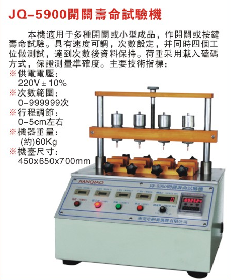 產品型號:JQ-5900 品牌:劍 喬 用途:一、產品介紹: 本機可對計算機、手機、記事本等到鍵盤作壽命測試。適用于多種開關或小型成品,作開關或按鍵壽命試驗,具有速度可調、次數設定,并達到次數后數據保持. 二、主